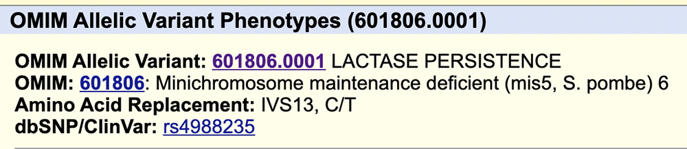Clicking into the OMIM item labeled 601806.0001, confirms that this SNV is linked to lactase persistence (Figure 5). The dbSNP/ClinVar line corroborates that this is the same rsID, and therefore variant, seen on the GWAS track.