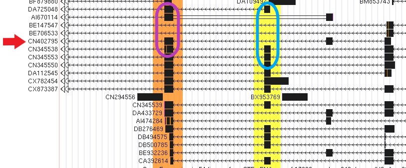 lines have been added to represent the splice pattern of the EST indicated by the red arrow in Figure 3 (CN402795).