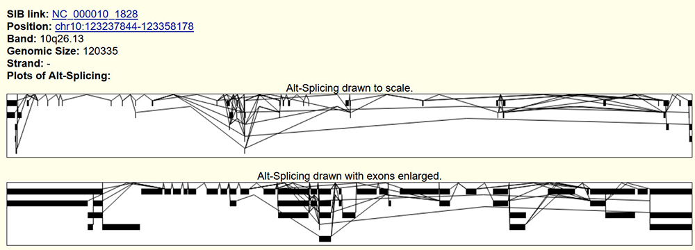Figure 5. "SIB Alt-Splicing" data track main page for the FGFR2 gene. Here, a more detailed representation of the possible RNA transcripts with their unique spliced variants is included. Link to example page within the FGFR2 gene: