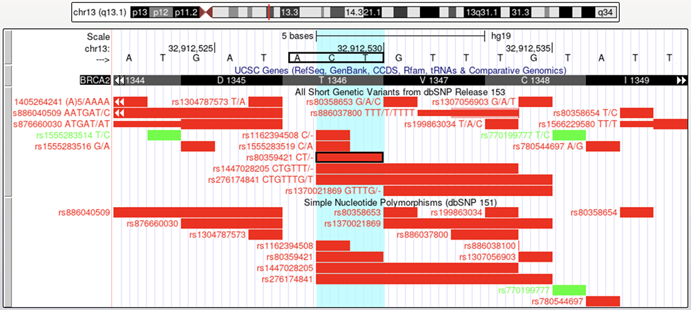 In Figures 1 and 2, the "UCSC Genes" track is displaying exon 11 of the BRCA2 gene. Below the "UCSC Genes" track are two "dbSNP" tracks, "dbSNP153" (upper) and "dbSNP151" (lower); these two tracks are different iterations of the same rsIDs and data, with some differences between the two data releases. The two tracks have different details available when clicking on one track or the other. Checking both versions of the rsID, or "reference SNP" can provide a wide range of insight into a variant.
