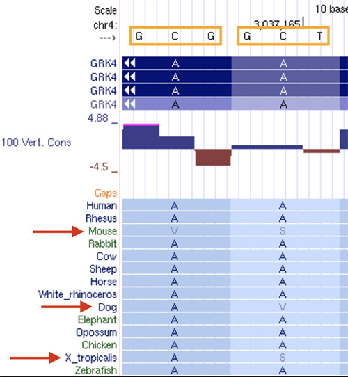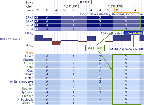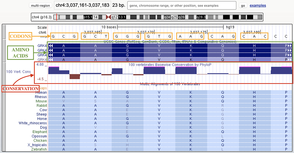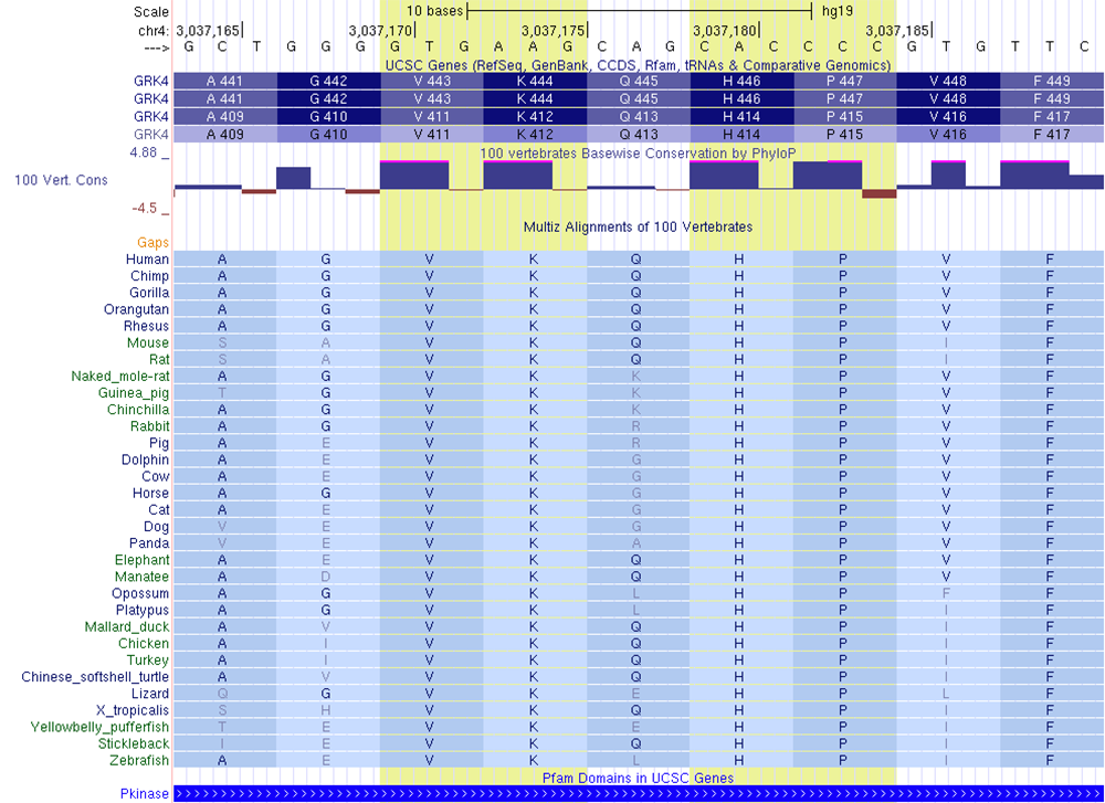 To further view wobble bases in the genome browser, we can turn on the Pfam track and include a few more species from each clade — https://genome.ucsc.edu/s/education/hg19_wobble2   The Pfam track displays conserved regions across species and across proteins in the same species; oftentimes, these regions are functionally important parts of the protein. They therefore have certain amino acids that are very well conserved through many species, indicating a functional role for those amino acid residues, such as the protein kinase domain in the GRK4 gene shown in the figure.  Note the high conservation score for the first two nucleotides of the codons for valine, lysine, histidine and proline residues in the session (but not the glutamine):  (VKqHP).